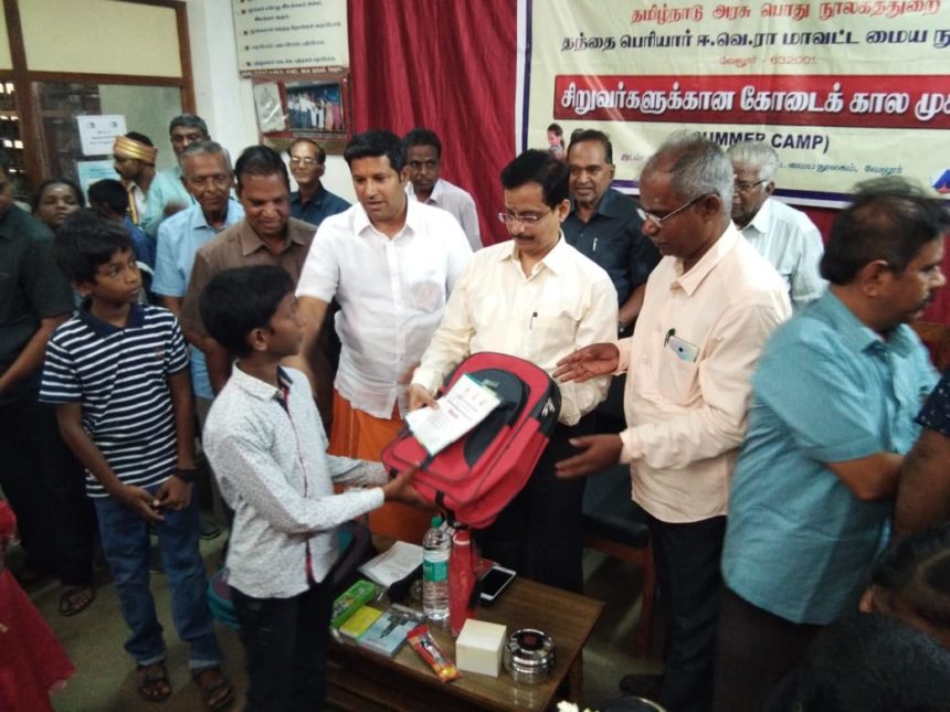 வேலூர் தந்தை பெரியார் ஈ.வெ.ரா.மாவட்ட மைய நூலகத்தில் இயக்கக அறிவுரையின்படி பள்ளி மாணாக்கர் கோடை விடுமுறையை பயனுள்ள வகையில் கழிக்கும் கோடை முகாம் – 2019 நிறைவு விழாவில் மாவட்ட ஆட்சியர் மற்றும் ஸ்ரீபுரம் ஸ்ரீ நாராயணி மருத்துவமனை மற்றும் ஆராய்ச்சி மைய இயக்குநர் திரு என்.பாலாஜி ஆகியோர் கலந்து கொண்டு முகாமில் பங்கேற்ற 114 மாணாக்கருக்கு சான்றிதழ் மற்றும் புத்தகப் பை, உணவு டப்பா, குடிநீர் போத்தல் உள்ளிட்ட 11 வகை நன்கொடை பொருட்கள் தந்து வாழ்த்தினர்.